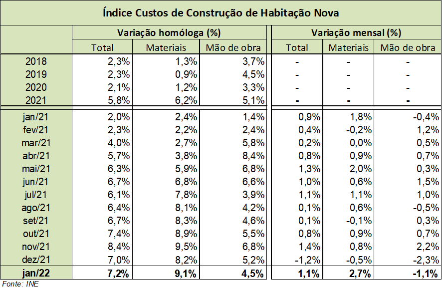 No mês de janeiro de 2022, o índice de custos de construção de habitação nova registou um acréscimo de 7,2%, em termos homólogos, taxa que é superior em 0,2 pontos percentuais (p.p.) à observada no mês anterior (7%).